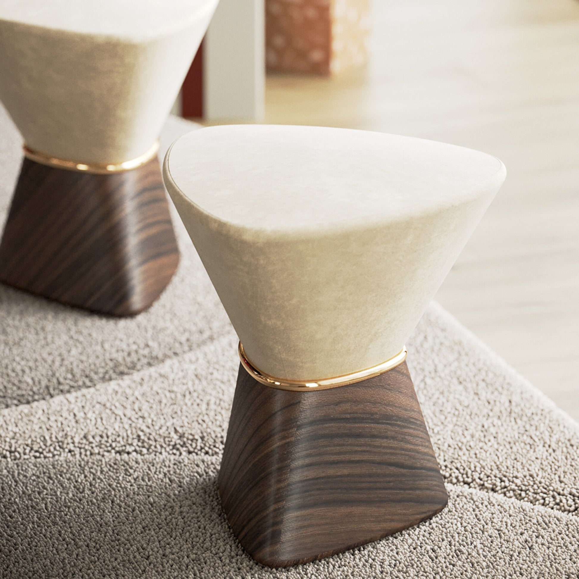 Elios is a sculptural statement—gracefully tapered, yet grounded in form. The velvet-clad top contrasts with a rich wooden base, joined by a soft golden ring of refinement. Ideal as a luxe accent stool or a contemplative perch in minimalist interiors.