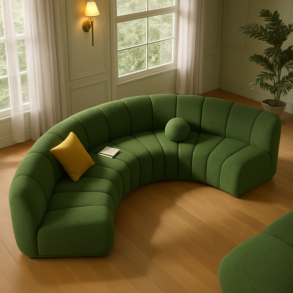Solar radiates quiet elegance, shaped like a soft arc of sunlight pouring into a tranquil room. Its plush, sculptural form invites conversation and closeness, wrapping you in warmth and ease. A centerpiece of serenity, designed to illuminate your space with comfort.