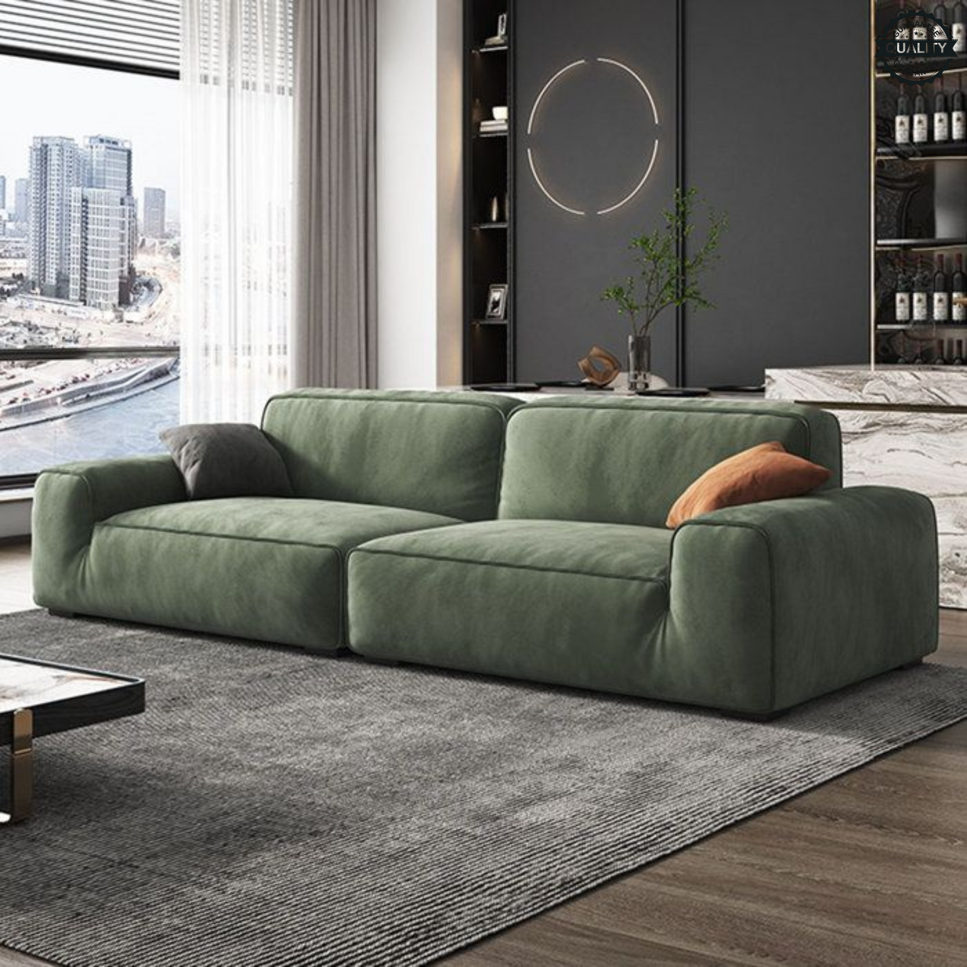Description: Low-slung, deep seat sofa designed for slow living and grounding energy in urban homes. Crafted in an earthy moss green, it wraps you in comfort like a soft meditation. Clean-lined and plush minimalism that breathes.